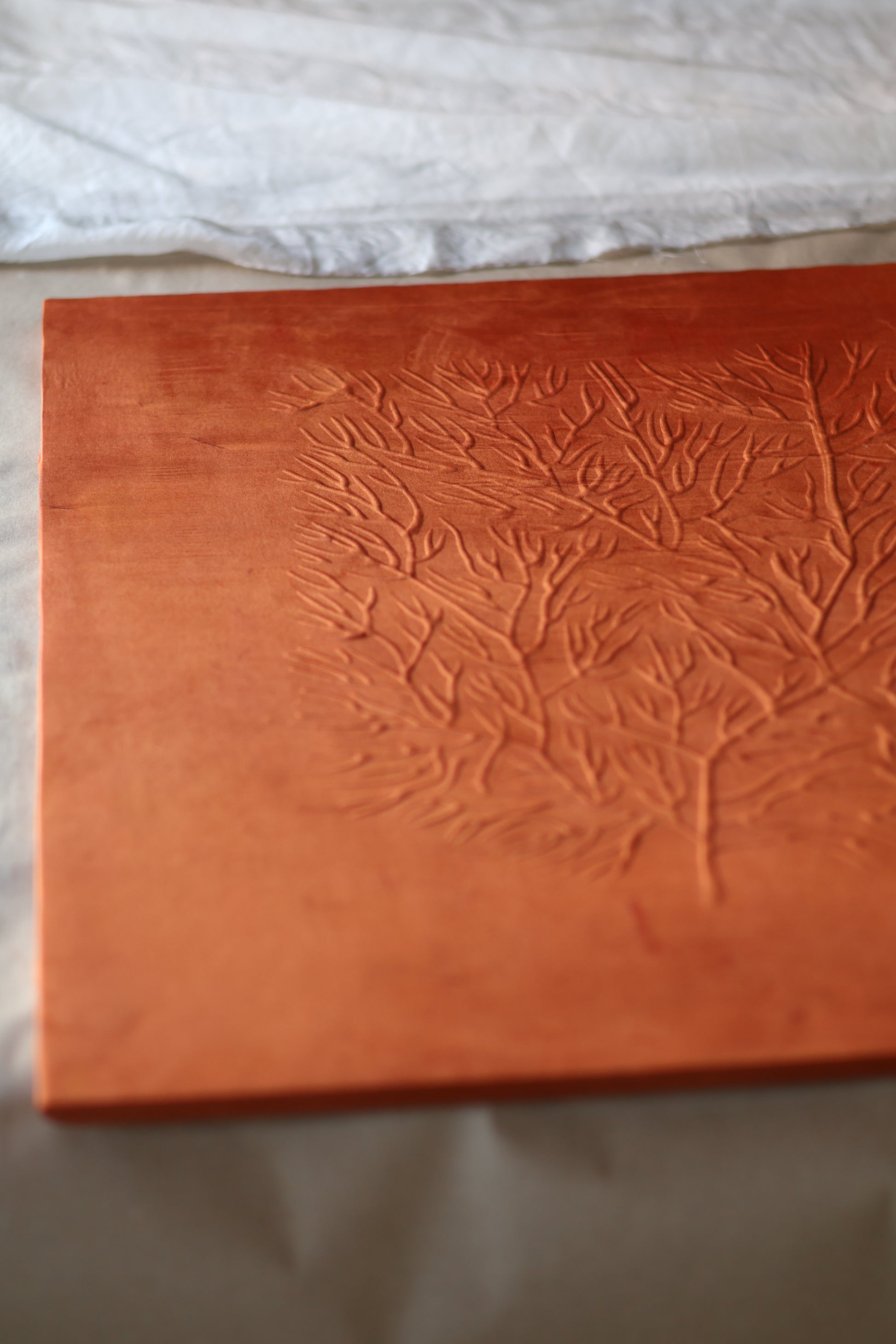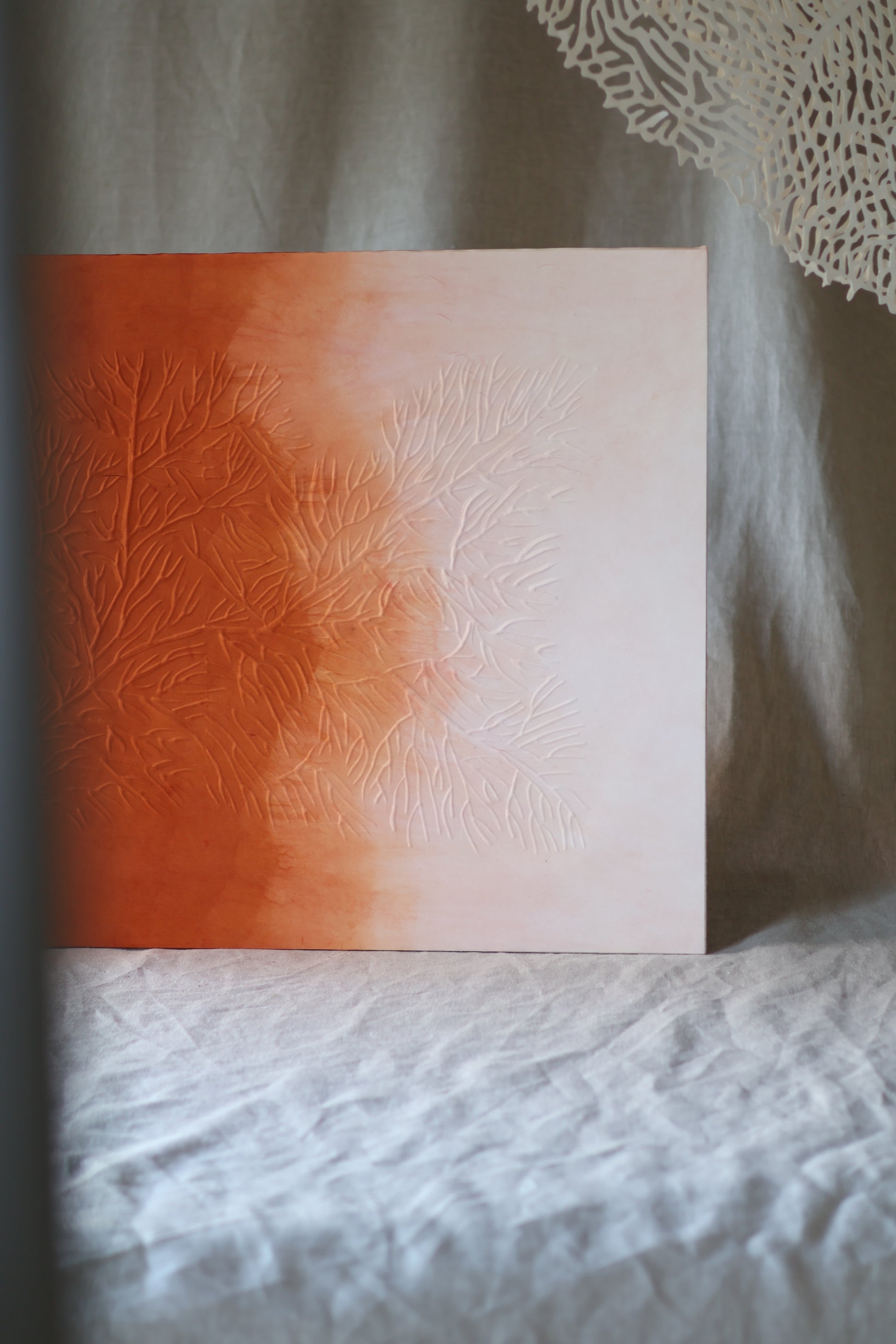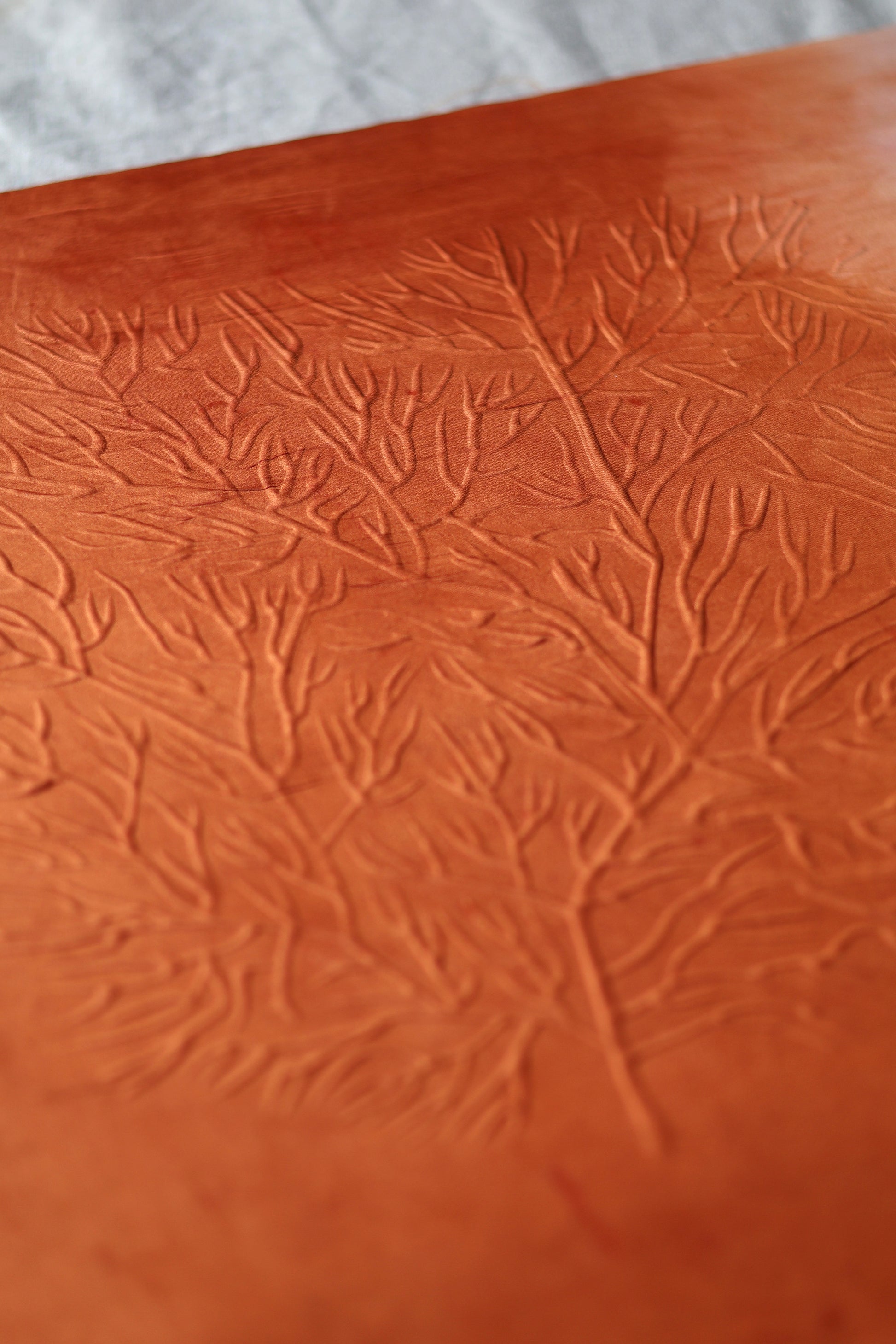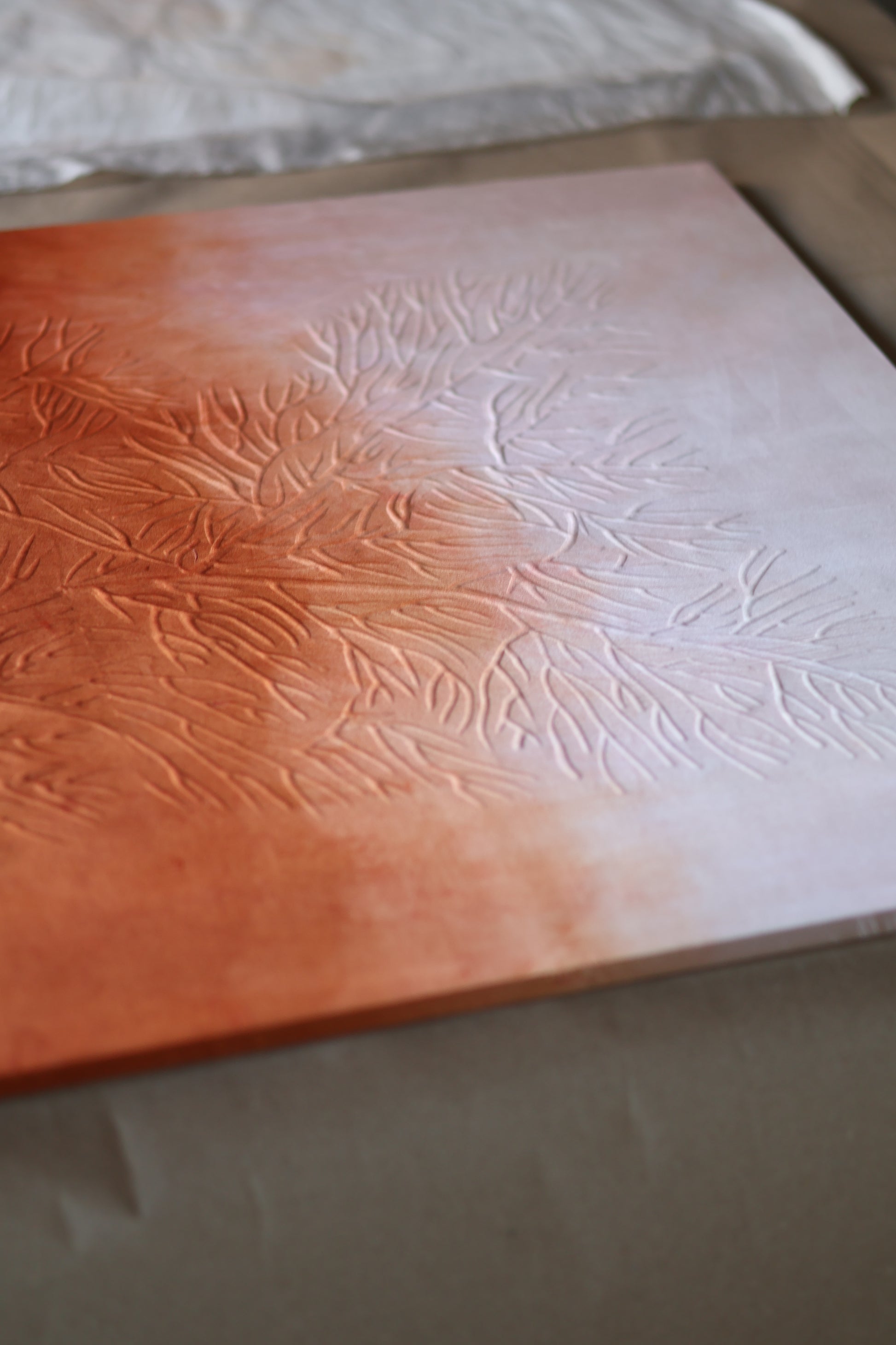 Teinture de Garance sur soie, embossage à la main sur tissu
