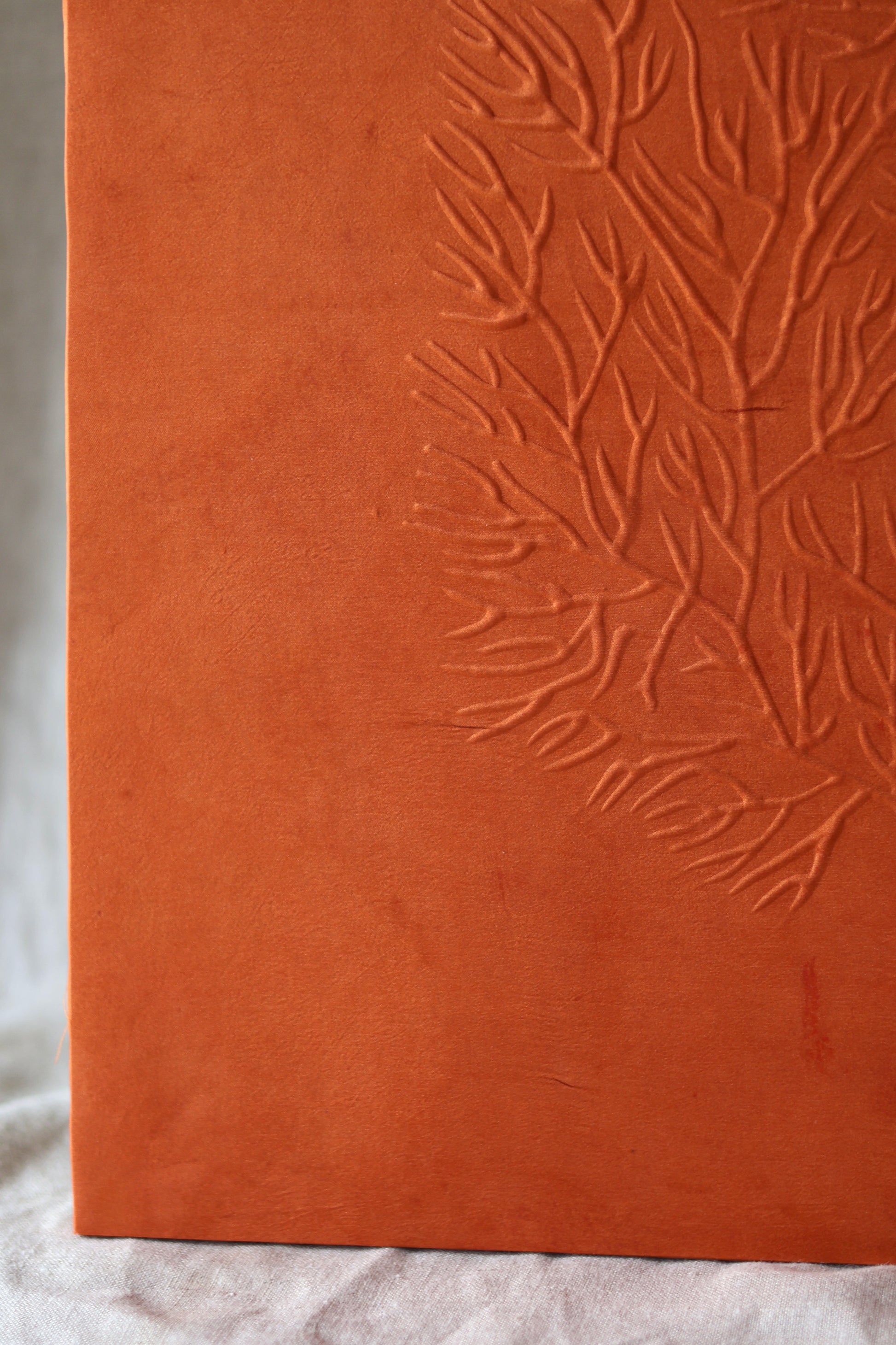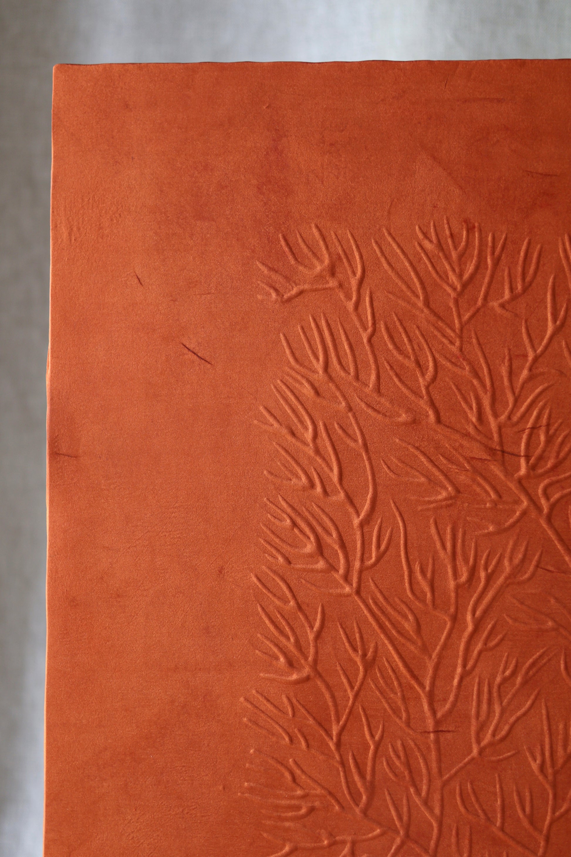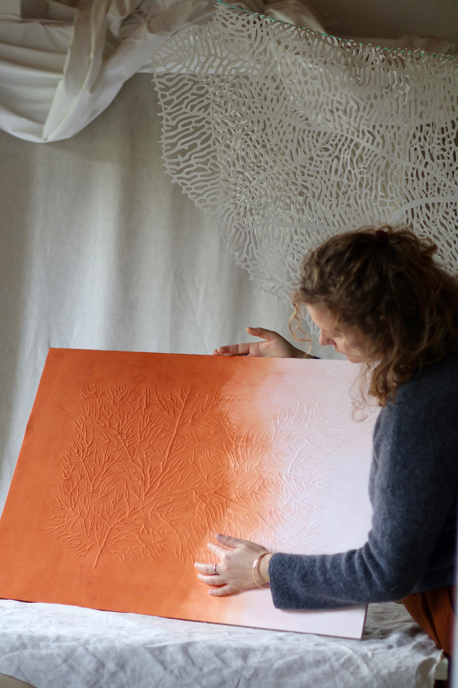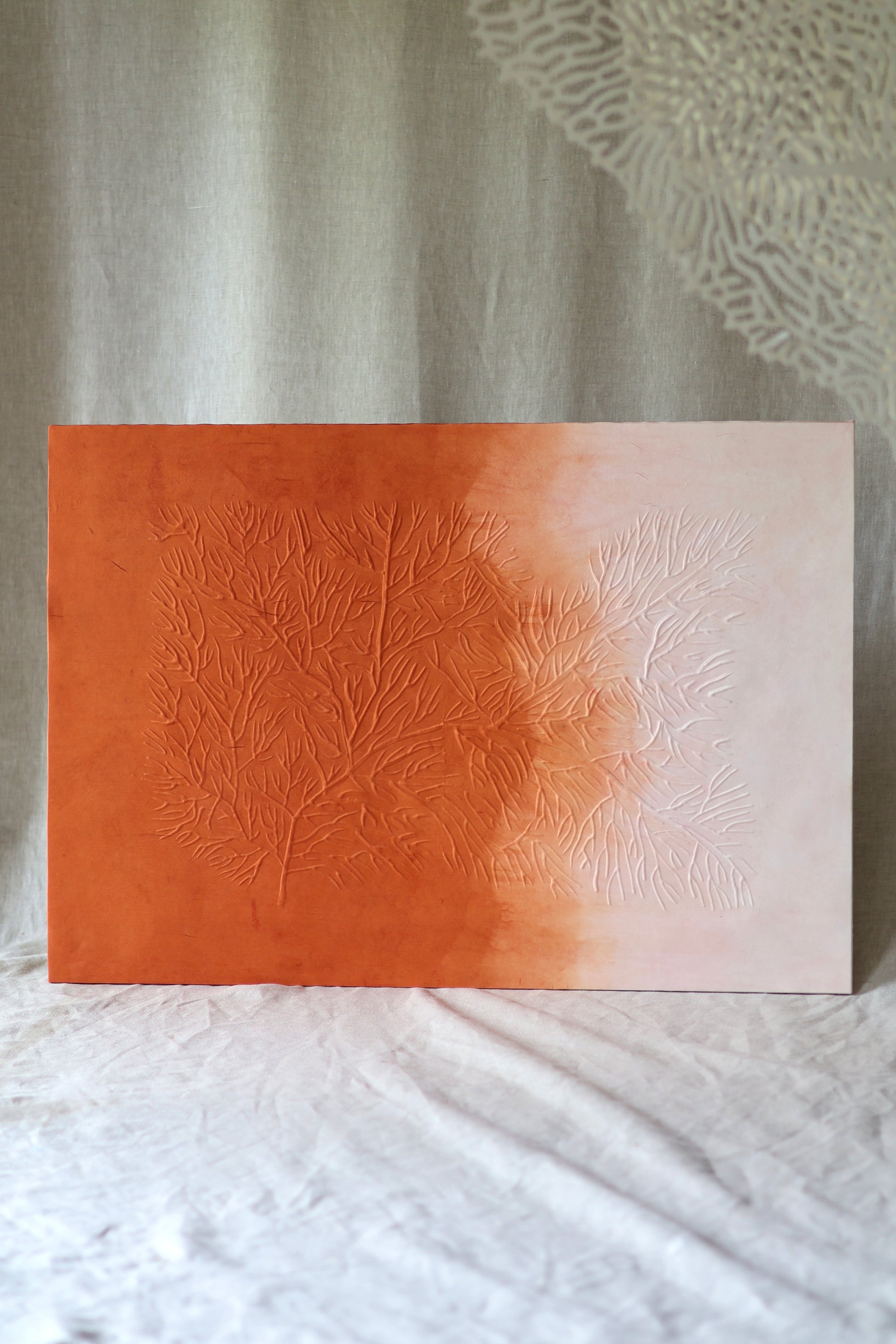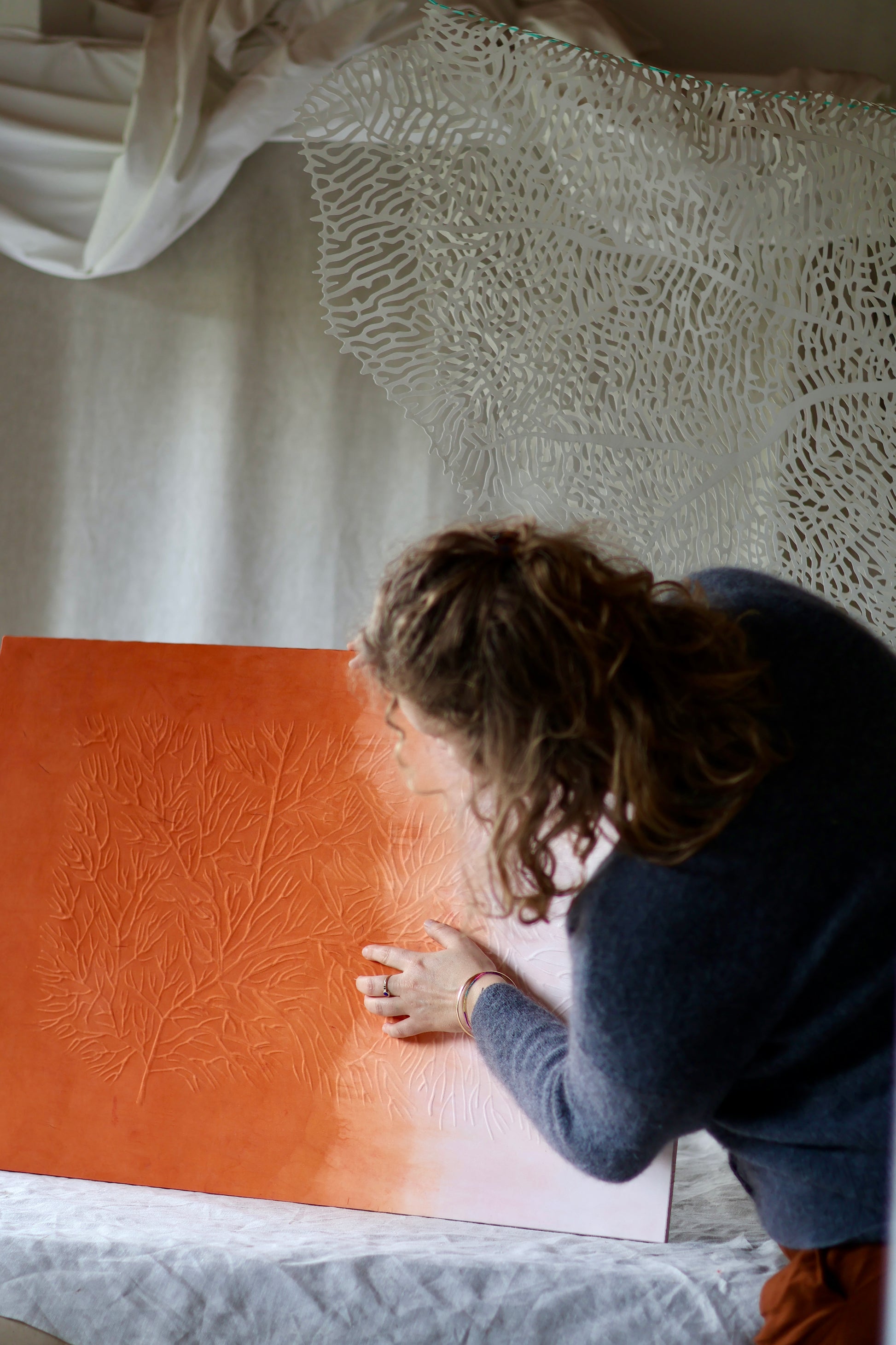 Teinture de Garance sur soie, embossage à la main sur tissu